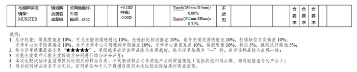 结果显示,14款具有散光度数的防控眼镜样品中,4款样品综合表现卓越获评五星;3款样品综合表现优秀获评四星;2款样品综合表现良好获评三星;5款样品综合表现一般,未获评星。其余5款无散光度数的防控眼镜样品中,1款样品综合表现卓越获评五星;1款样品综合表现优秀获评四星;2款样品综合表现良好获评三星,1款样品综合表现一般,未获评星。