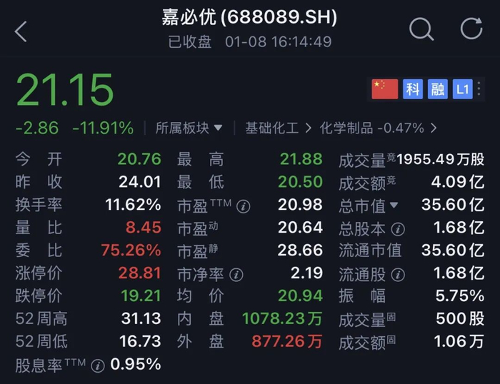 受此影响。今日开盘,嘉必优股价大跌,截至收盘,其股价大跌11.91%,报收21.15元。