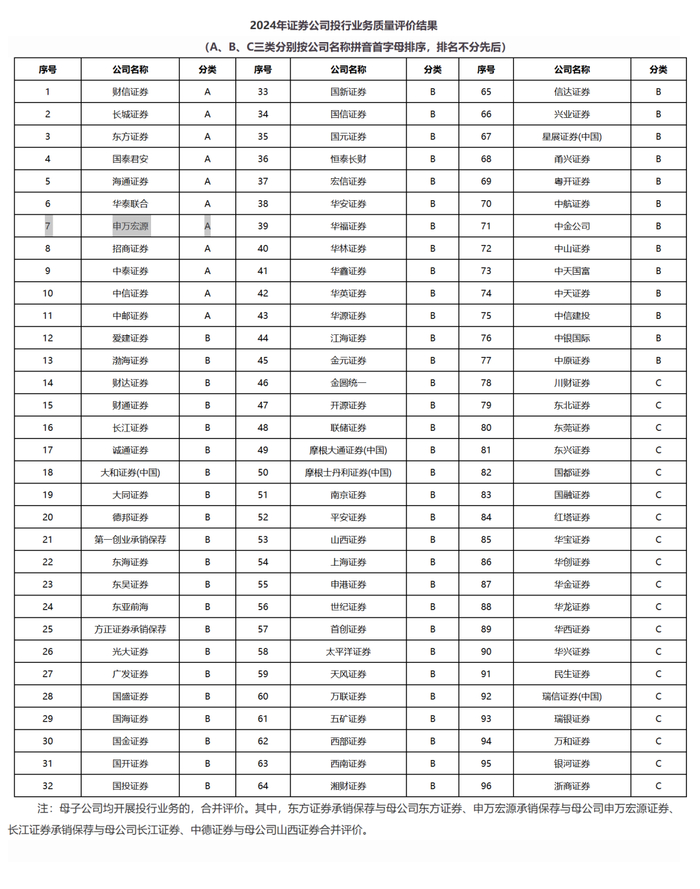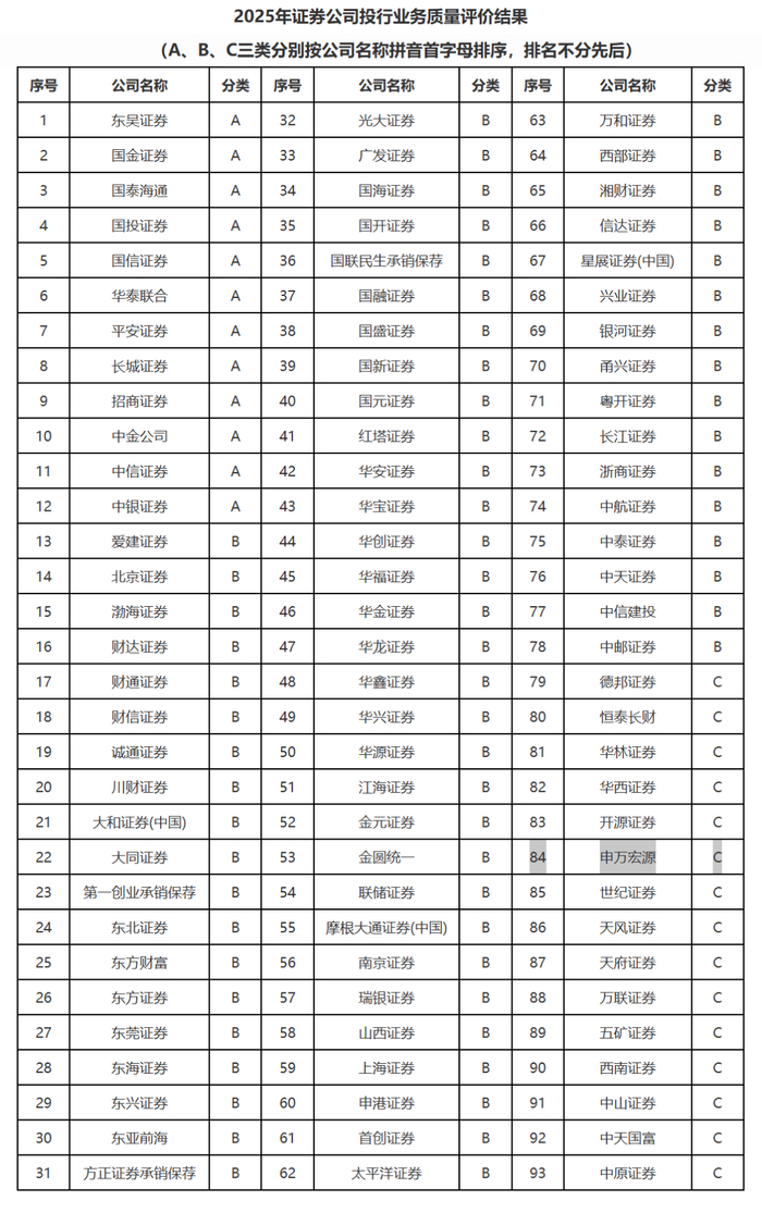 本次评价对象包括2024年1月1日至12月31日开展股票保荐、债券承销、并购重组财务顾问和全国股转公司(北交所)相关投行业务的93家证券公司,仅开展持续督导业务的证券公司未纳入评价范围。根据《证券公司投行业务质量评价办法(2025年修订)》,评价结果分为A、B、C三类,本次评价结果A类12家、B类66家、C类15家。其类别的划分主要反映参评证券公司股票保荐、债券承销、并购重组财务顾问和股转公司(北交所)等四类投行业务执业质量、内控制度建设与执行、服务高水平科技、支持上市公司并购重组及新股估值定价等情况的相对水平,不涉及对证券公司资信状况和业务资格的评价。