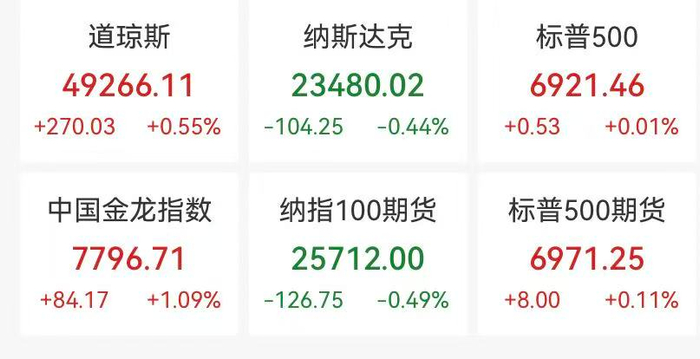 具体来看,大型科技股多数下跌,英特尔跌超3%,英伟达跌逾2%,微软跌超1%,苹果小幅下跌;谷歌、亚马逊、特斯拉涨超1%。