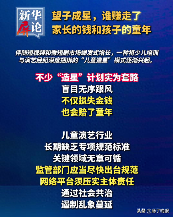 近日,《新华每日电讯》连续刊发深度调查《数万元换一场空,谁在收割家长?——起底“童星梦”背后的产业链陷阱》、评论《望子成星,谁赚走了家长的钱和孩子的童年》,揭露“儿童造星”乱象,报道引发强烈反响。