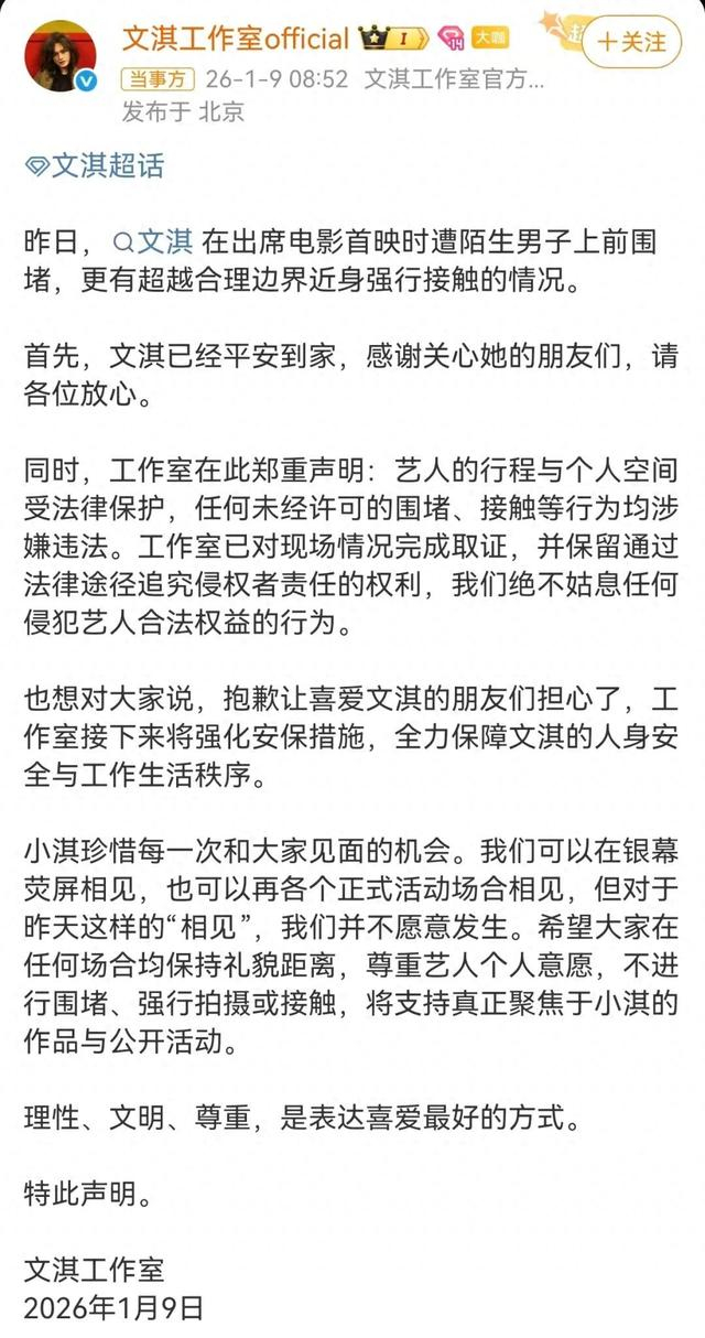 昨日,文淇在出席电影首映时遭陌生男子上前围堵,更有超越合理边界近身强行接触的情况。