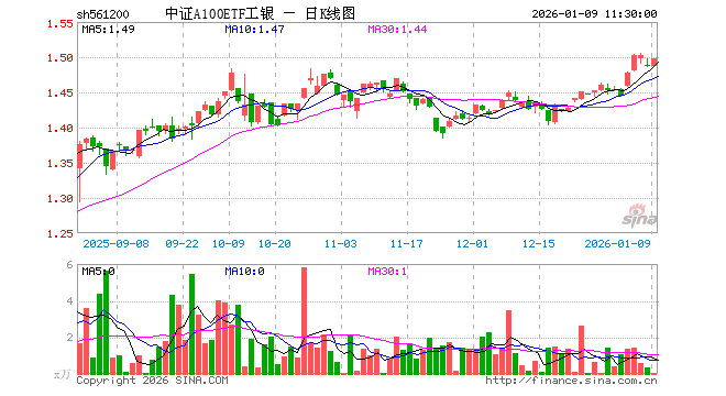 1月9日,截止午间收盘,中证A100ETF工银(561200)涨0.81%,报1.498元,成交额898.00元。中证A100ETF工银(561200)重仓股方面,宁德时代截止午盘涨0.05%,贵州茅台涨0.43%,中国平安跌1.99%,招商银行跌0.82%,紫金矿业涨2.51%,美的集团涨0.67%,中际旭创跌1.66%,寒武纪跌0.37%,长江电力跌0.26%,兴业银行跌0.57%。