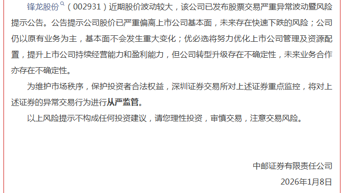 事实上,锋龙股份已多次发布异动风险提醒公告。1月8日晚间,锋龙股份再度发布公告明确,股价已严重偏离基本面,存在快速下跌风险,若股价继续异常上涨可能申请停牌核查。公告强调,当前公司仍以原有业务为主,基本面不会发生重大变化;且未来36个月内,优必选不存在通过上市公司重组上市的计划或安排。