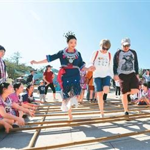 在三亚南山文化旅游区,景区演员和外国游客跳竹竿舞。陈文武摄(人民图片)
