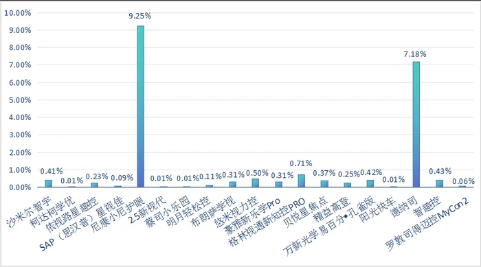 测试结果显示,19款儿童青少年近视防控眼镜样品的顶焦度偏差均符合国家标准GB 13511.1-2011《配装眼镜 第1部分:单光和多焦点》要求,柱镜顶焦度偏差均为0.00D,球镜顶焦度偏差测试结果见图。