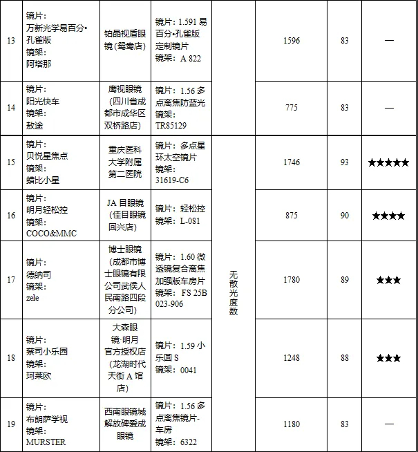 注:1. 有散光度数和无散光度数镜片分别进行综合评分评星;2. 得分相同样品排名不分先后。