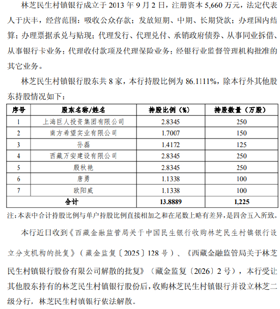 此外,西藏金融监管局同意林芝民生村镇银行解散,全部业务、财产、债权债务以及其他各项权利义务等均由中国民生银行股份有限公司承接。