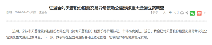 1月9日晚间,证监会发布公告,宁波市天普橡胶科技股份有限公司(简称天普股份)股票价格异常波动,市场高度关注。近日,证监会已对天普股份股票交易异常波动公告涉嫌重大遗漏立案调查。下一步,证监会将在全面调查的基础上依法处理,切实维护市场健康稳定发展。