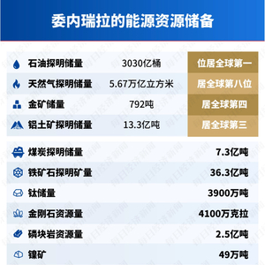 数据显示,委内瑞拉已经探明的石油储量高达3030亿桶,约占全球的17%,位居全球第一。