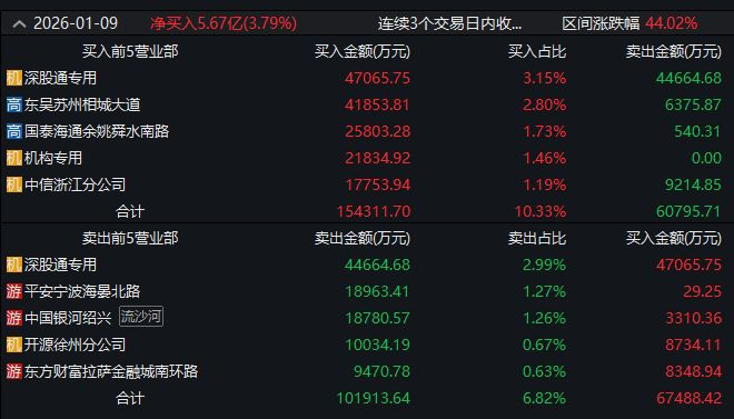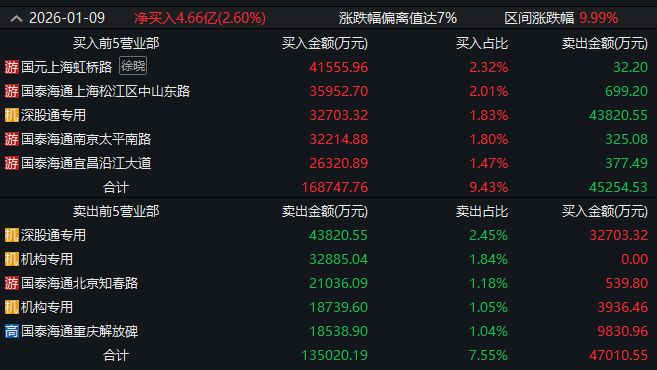 乾照光电龙虎榜信息显示,深股通席位买入4.7亿元,“余哥”所在的东吴证券苏州相城大道营业部买入4.18亿元,1月9日是乾照光电的第二个20cm涨停。值得注意的是,“赵老哥”所在的银河证券绍兴营业部卖出1.54亿元。