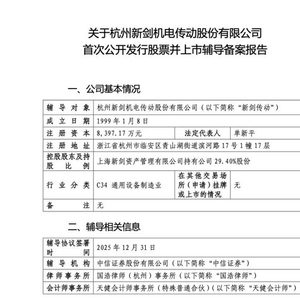 辅导备案报告显示,新剑传动行业分类为C34通用设备制造业。上海新剑资产管理有限公司持有新剑传动29.40%股份,为其控股股东。根据规划,辅导人员将于2026年4月至2026年5月,对新剑传动是否达到发行上市条件进行综合评估,协助新剑传动按相关规定准备首次公开发行股票并上市申请文件。