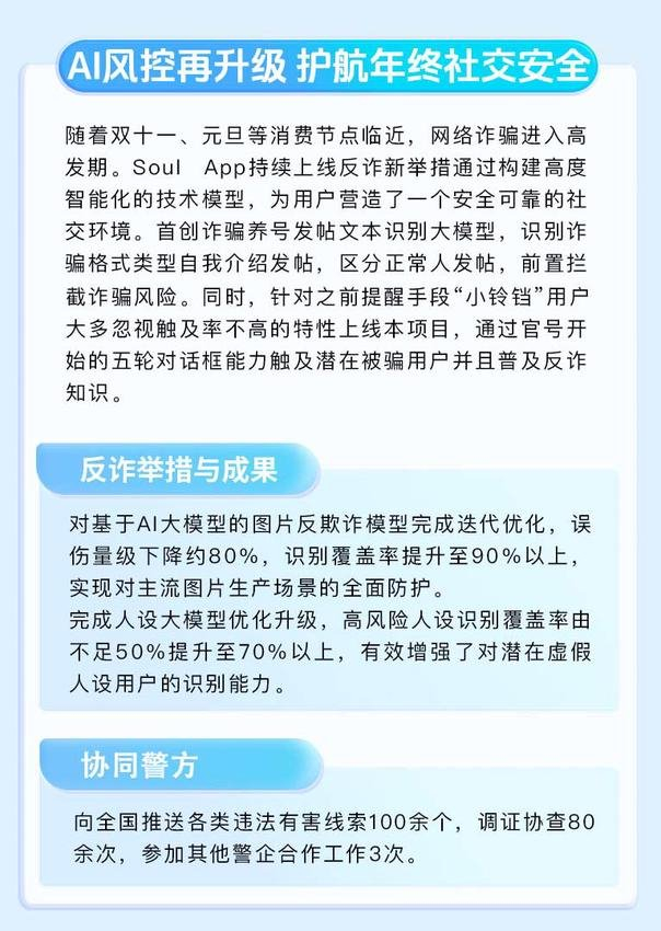 面对更具隐蔽性的网络黑产,Soul在反诈风控体系中持续强化技术能力。Q3报告显示,平台对基于AI大模型的图片反欺诈模型进行优化后,误伤量级下降约80%,识别覆盖率提升至90%以上,覆盖主流图片生产场景;在人设风险识别方面,人设大模型对高风险人设的识别覆盖率提升至70%以上,使风险在用户建立联系初期即被拦截。