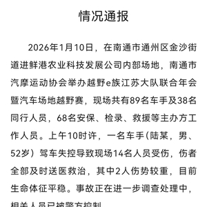 1月10日,江苏省南通市通州区人民政府办公室发布情况通报:2026年1月10日,在南通市通州区金沙街道进鲜港农业科技发展公司内部场地,南通市汽摩运动协会举办越野e族江苏大队联合年会暨汽车场地越野赛,现场共有89名车手及38名同行人员,68名安保、检录、救援等主办方工作人员。上午10时许,一名车手(陆某,男、52岁)驾车失控导致现场14名人员受伤,伤者全部及时送医救治,其中2人伤势较重,目前生命体征平稳。事故正在进一步调查处理中,相关人员已被警方控制。