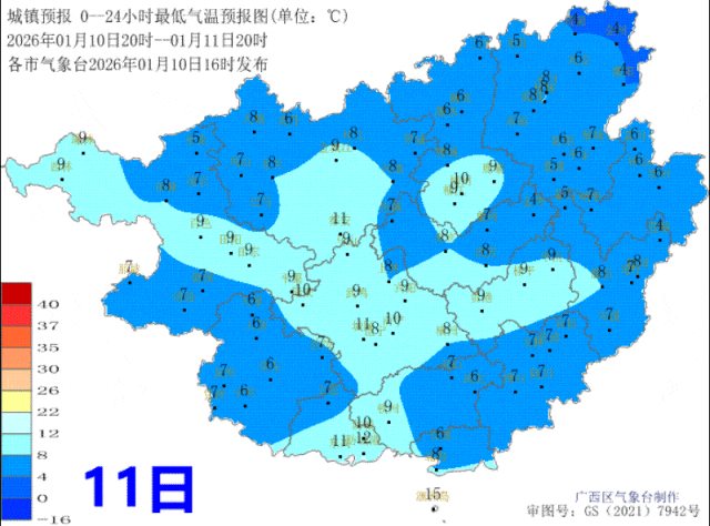 11日晚上到13日白天,全区晴到多云,高寒山区和桂东北局地有霜冻或冰冻。最低气温:高寒山区-1~4℃,桂东北4~8℃,其它地区7~13℃。