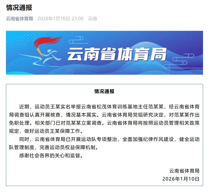 同时,云南省体育局已开展运动队专项整治,全面加强纪律作风建设,健全运动队管理制度,完善运动员权益保障机制。