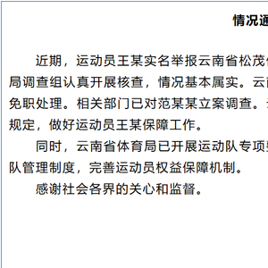 近期,运动员王某实名举报云南省松茂体育训练基地主任范某某,经云南省体育局调查组认真开展核查,情况基本属实。云南省体育局党组研究决定,对范某某作出免职处理。相关部门已对范某某立案调查。云南省体育局将按照运动员管理相关政策规定,做好运动员王某保障工作。