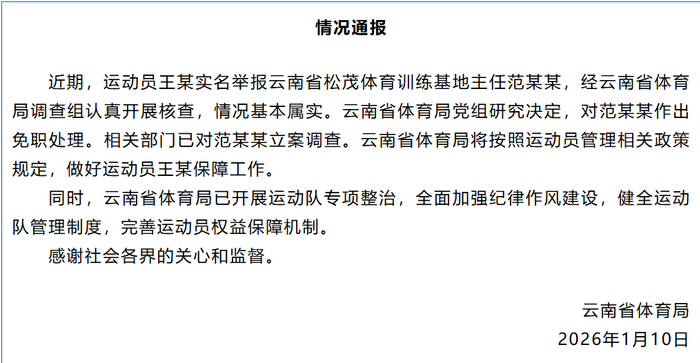 云南省体育局:运动员王某实名举报范某某情况基本属实,对范某某作出免职处理并立案调查