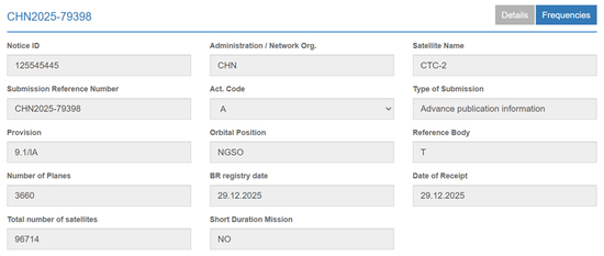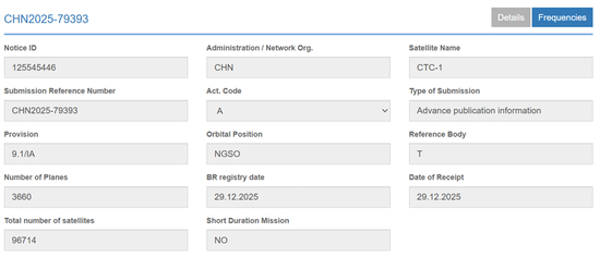 而在登记注册的前一天(12月29日),CTC-1和CTC-2这两个巨型卫星星座计划即以无线电创新院的名义向ITU提交了申请。