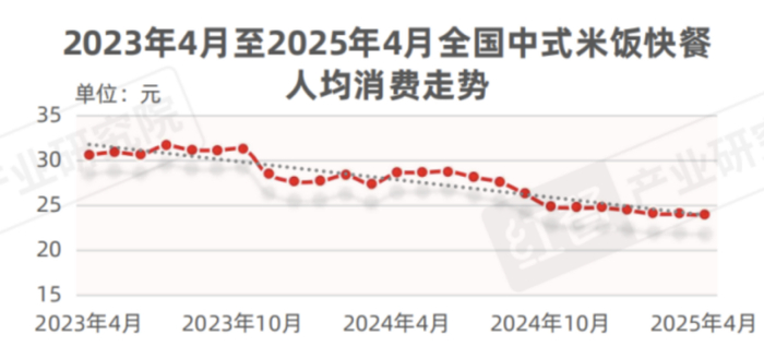 与正餐不同,快餐的客单价相对较低,利润空间本就不大。据红餐网大数据,中式米饭快餐的人均消费走势在不断下滑,截至2025年4月,人均消费降至24元。