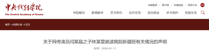 近日,网络上出现有关演员闫某晶之子林某霏曾就读“中戏新疆班”的信息,引发公众关注与讨论。经核查,现作出如下声明。