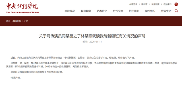 1月11日,中央戏剧学院网站发布关于网传演员闫某晶之子林某霏就读我院新疆班有关情况的声明: