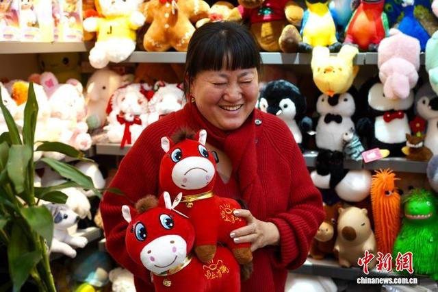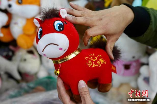 1月11日,采购商估算“哭哭马”尺寸。一位网友近日购入产自浙江义乌的马年毛绒玩具,发现一只次品——其嘴部被缝反,看上去十分委屈。“笑笑马”变成了“哭哭马”,相关话题冲上中国多个社交平台热搜榜,采购订单飞增,商户开了十多条生产线正加紧赶货。中新社记者 董易鑫 摄