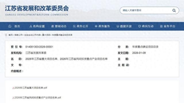 日前,江苏省发展改革委官网发布2026年江苏省重大项目清单和省民间投资重点产业项目清单。
