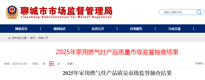 山东省聊城市市场监督管理局公布2025年家用燃气灶产品质量市级监督抽查结果
