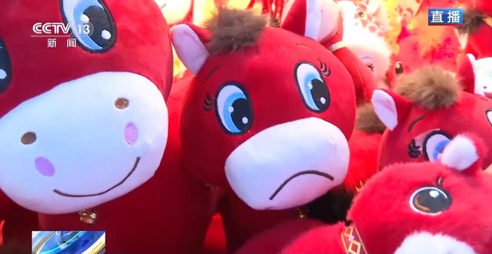 总台记者 夏周:我在义乌小商品市场毛绒玩具专区的一位商户的店铺里观察了一下,其中一款叫“马上有钱”的毛绒玩具是去年10月中旬上架的,有5个不同尺寸。当初为了定版,前前后后花了半个月,因为当时老板娘觉得马嘴用黄色更醒目,而设计团队觉得白色更时尚,最终老板娘听取了他们的建议,把马嘴定版为白色。当初老板娘对这款小马的市场前景并没有太大把握,上市之后每天大概能卖400个左右,不算爆款。但今年一月份,因为生产线上工人的一个小小失误让它快速出圈了。