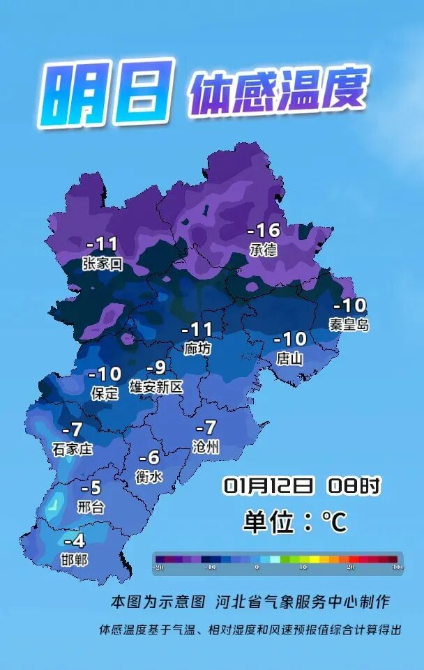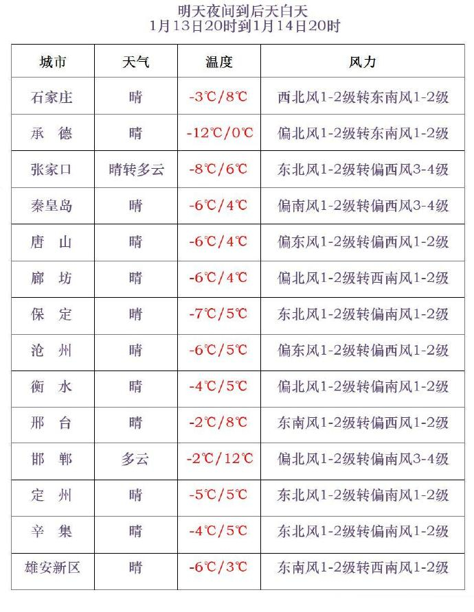 今天傍晚到夜间,张家口、承德晴转多云,其他地区晴间多云。最低气温,张家口、承德、秦皇岛北部-28~-12℃,其他地区-11~-1℃。