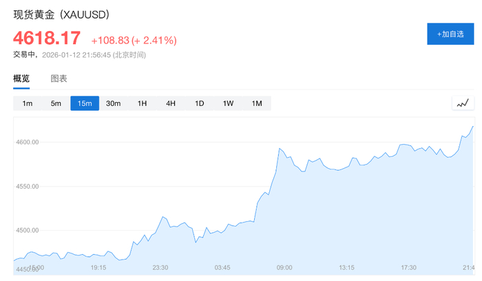 美国司法部对美联储主席鲍威尔启动调查,引发市场对央行独立性的担忧,避险情绪激增推动现货黄金一度突破4620美元/盎司,创历史新高,日内涨幅达2.4%。美元、美股期货和美债同步下跌,“抛售美国”交易情绪重现市场。