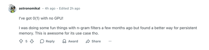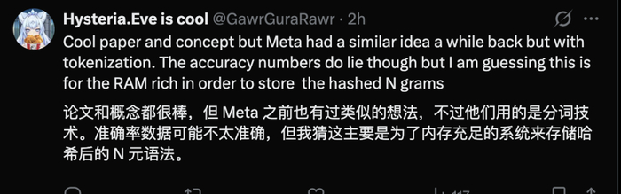 同时,有用户对这种基于 n-gram lookup 的机制表达了直观兴趣,他评论道: