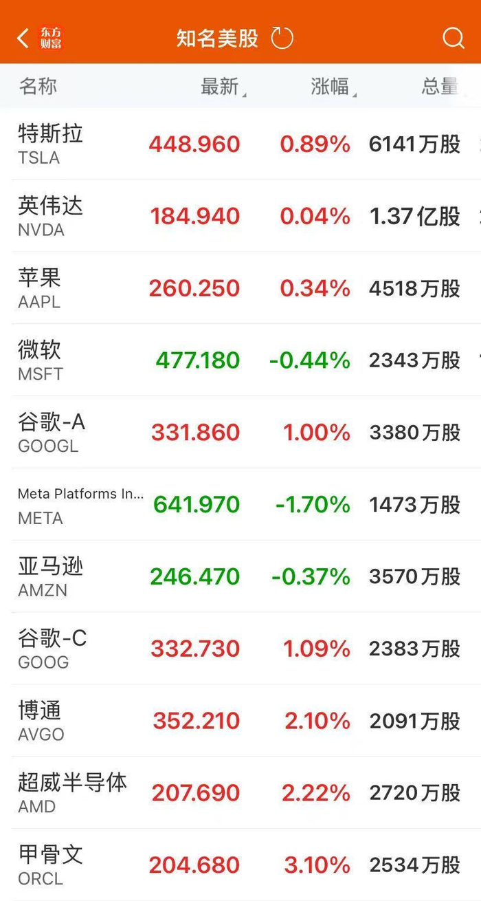特斯拉涨0.89%,苹果涨0.34%,英伟达涨0.03%,亚马逊跌0.37%,微软跌0.44%,Meta跌1.7%。
