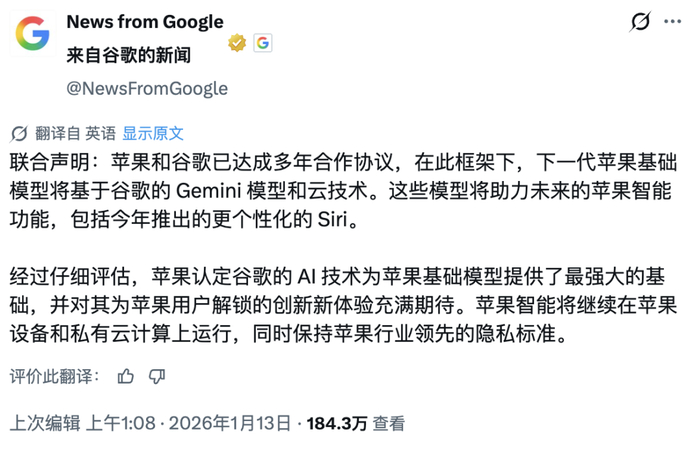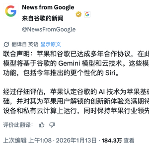 按照联合协议, Google Gemini 模型将运行在苹果的「私有云计算」服务器上, 用户数据不会接触 Google 的系统。这意味着苹果既能享受 Google 的技术, 又能保持对用户隐私的掌控。