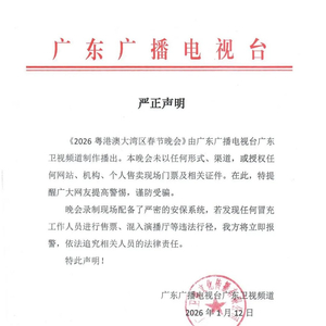 《2026粤港澳大湾区春节晚会》由广东广播电视台广东卫视频道制作播出。本晚会未以任何形式、渠道,或授权任何网站、机构、个人售卖现场门票及相关证件。在此,特提醒广大网友提高警惕,谨防受骗。