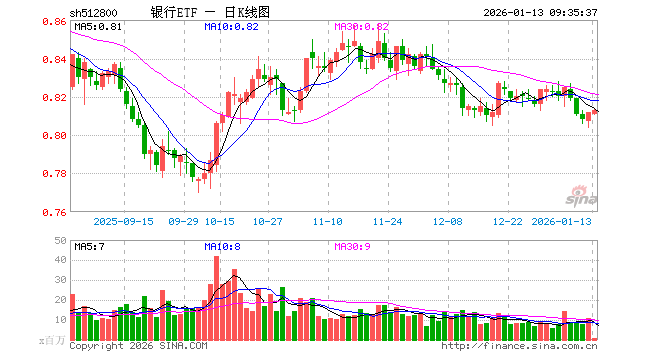 1月13日,银行ETF(512800)开盘跌0.12%,报0.811元。银行ETF(512800)重仓股方面,招商银行开盘涨0.19%,兴业银行涨0.10%,工商银行涨0.13%,农业银行跌0.27%,交通银行涨0.14%,江苏银行跌0.29%,浦发银行涨0.51%,平安银行涨0.00%,民生银行涨0.00%,上海银行涨0.00%。
