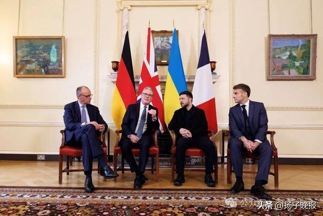 2025年12月8日,在英国伦敦唐宁街10号首相府,英国首相斯塔默(左二)、法国总统马克龙(右一)、德国总理默茨(左一)与乌克兰总统泽连斯基举行会谈。新华社发(英国首相府供图)