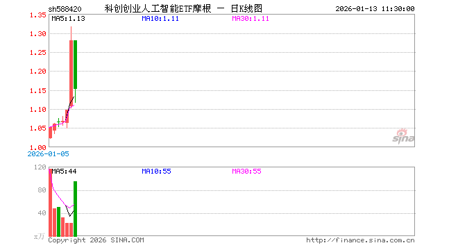 1月13日,截止午间收盘,科创创业人工智能ETF摩根(588420)跌9.93%,报1.152元,成交额1.10亿元。科创创业人工智能ETF摩根(588420)重仓股方面,寒武纪截止午盘跌5.63%,澜起科技跌1.93%,新易盛跌1.91%,中际旭创跌0.68%,金山办公涨0.09%,芯原股份涨0.01%,润泽科技跌1.45%,北京君正跌3.93%,昆仑万维涨1.30%,协创数据跌0.64%。