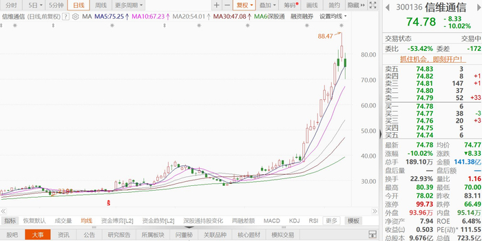 格隆汇1月13日|昨日创下历史新高的信维通信(300136.SZ)今日大跌,现跌10.02%报74.78元,总市值723.5亿元。信维通信昨日公告,公司实际控制人、董事长、总经理彭浩计划自公告披露之日起15个交易日后的3个月内(2026年2月3日至2026年5月2日),通过集中竞价方式减持不超过963.76万股公司股份,即不超过公司当前总股本(剔除回购股份)的1.00%。自去年12月以来,信维通信股票一路走高。2025年11月24日—2026年1月12日这34个交易日,信维通信区间累计涨幅接近197%。(格隆汇)