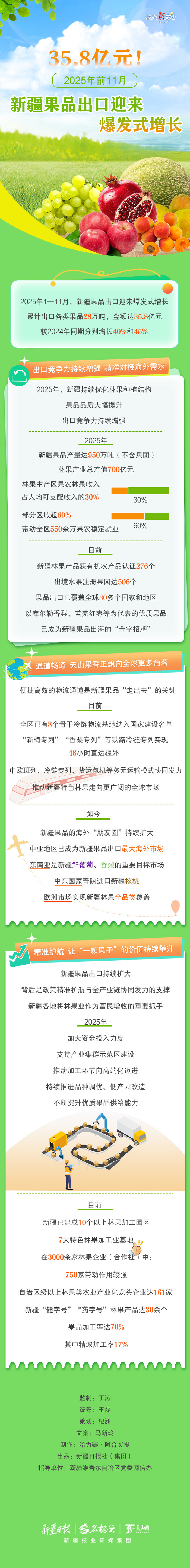 2025年1—11月,新疆果品出口迎来爆发式增长,累计出口各类果品28万吨,金额达35.8亿元。新疆果品加速拓展海外市场,交出了一份亮眼答卷。新疆果品如何做到香飘海外的?有哪些“金字招牌”?都出口到了哪里?本期《数说“新”变化》一起来了解。