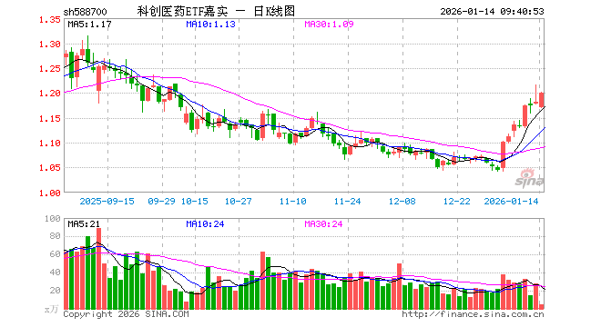 1月14日,科创医药ETF嘉实(588700)开盘跌0.93%,报1.170元。科创医药ETF嘉实(588700)重仓股方面,联影医疗开盘涨0.02%,百济神州涨1.71%,百利天恒跌0.58%,惠泰医疗跌0.82%,艾力斯跌0.02%,君实生物跌0.76%,泽璟制药涨0.57%,荣昌生物跌1.28%,博瑞医药跌0.24%,华大智造跌0.75%。