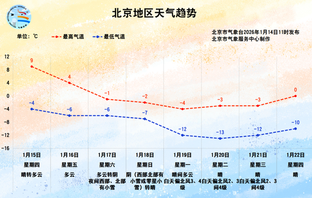 明后天北京天气晴到多云,白天最高气温波动较大,15日白天最高气温升至9℃,中午前后比较舒适,受冷空气影响,16日白天最高气温又降至4℃,在北风的加持下,体感寒冷,请大家注意防寒保暖,谨防感冒。