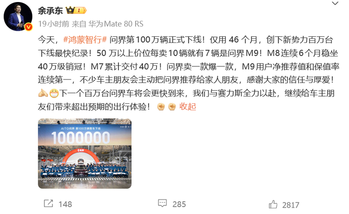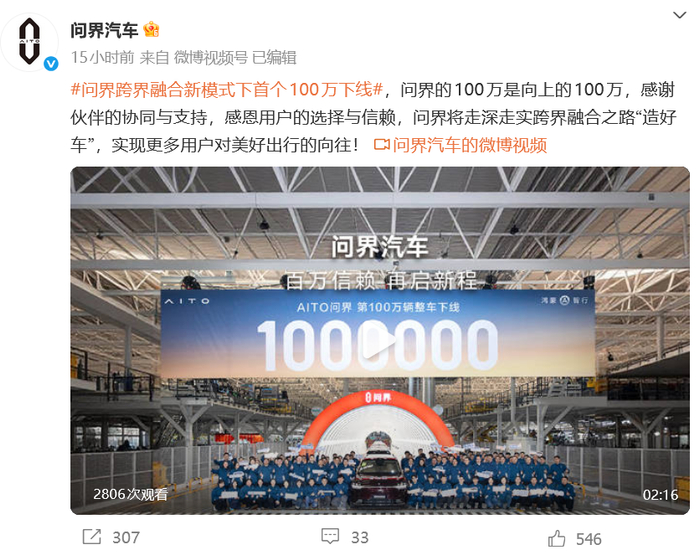 问界第一个100万用了五年,第二个100万力争在两年内完成。