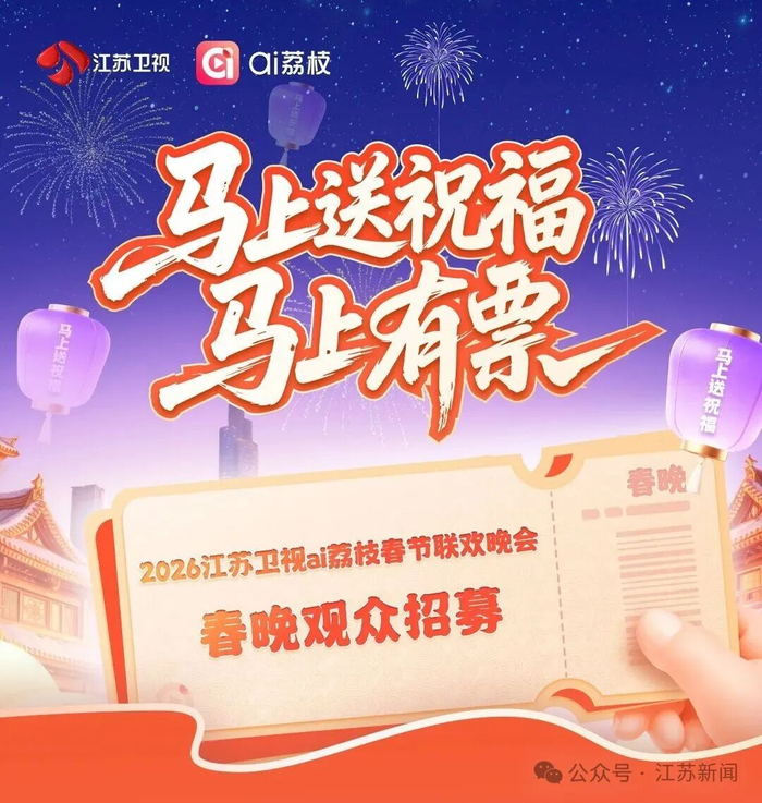 宝子们注意啦!@江苏新闻 带着重磅福利来宠粉咯🎉 想亲身感受春晚录制的热闹氛围吗?想近距离见证精彩节目的诞生吗?现在机会来啦!直通2026江苏卫视ai荔枝春节联欢晚会录制现场,10张门票等你来抢,让2026从惊喜与好运开始吧!