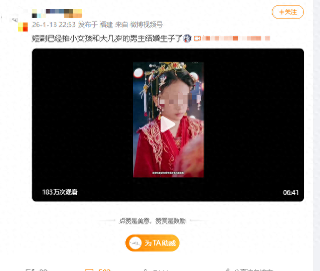 该短剧的女主角魂穿成婴儿出生,凭借锦鲤气运帮助哥哥成为丞相,在她七岁这年,因二姐不满皇帝赐婚,于是年仅七岁的女主在哥哥的安排下,代替姐姐嫁入将军府,婚后被将军宠上天,并帮助将军府混的风生水起,大结局里还有七年后女主角生子的剧情。演职人员表显示,剧中女主角的饰演者实际年龄为11岁,是未成年儿童,男主角的饰演者为成年男性。尽管也有观众指出该剧没有什么亲密戏份,只有几个搂抱、牵手等肢体接触的镜头,但因剧情涉及7岁嫁人、15岁生子等剧情设定,还是引发了大规模伦理争议,“11岁的和30岁的演感情戏,这对吗?”“短剧一点道德底线都不要了吗?”“真是越来越荒唐了。”还有人去看了一下该短剧的原小说,情节大同小异“粗略翻了下原著,写的是这个女孩7岁被逼嫁人,16岁和将军补了婚礼,17岁生娃。小说这样拍出来真的感觉好不适啊,还真的找了个这么稚嫩的演员。”