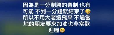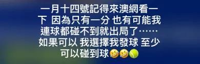 此前,周杰伦曾发文称,由于担心自己连球都碰不到就出局,希望能够选择由自己发球。还自嘲称,因为是一分制胜的赛制,有可能比赛不到一分钟就结束了,所以不建议粉丝朋友们大老远飞到现场观赛,但同时也欢迎当地的朋友到现场为其加油。没想到比赛中当真没有碰到球。