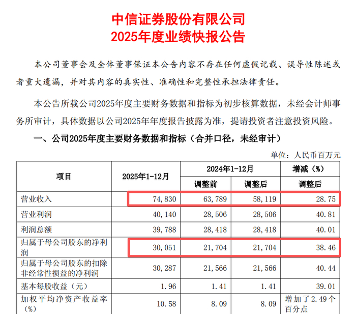 【导读】中信证券发布2025年度业绩快报,全年归母净利润突破300亿元