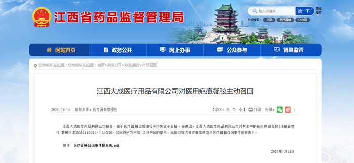 江西大成医疗用品有限公司报告,由于医疗器械监督抽检平均装量不合格等原因,江西大成医疗用品有限公司对其生产的医用疤痕凝胶(注册备案号:赣械注准20252140019)主动召回,召回级别为三级,涉及产品的型号、规格及批次等详细信息见《医疗器械召回事件报告表》。