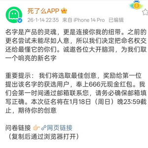 “死了么”APP征集新中文名,最佳创意奖励666元